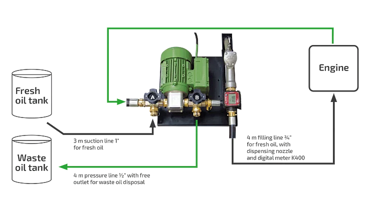 The pump has two suction lines and two pressure lines. These hose lines connect it to the engine, a used oil tank, and a tank containing fresh engine oil. The arrangement of the pump and lines remains unchanged, regardless of whether used oil is being pumped out or fresh oil is being pumped into the engine. The four lines can be opened and closed by turning the two multifunction taps.