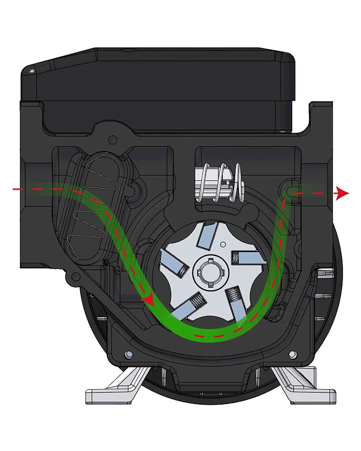 ZUWA's vane pumps feature an eccentrically designed housing, with lamellas (sliders and springs) creating sealed chambers that expand and contract as the motor rotates. When the chambers expand, they suck in the clean pumped medium; when they contract, the medium is expelled again via the pressure side.