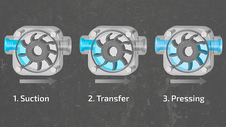 With the turning of the impeller the fluid is positively displaced from the inlet to the outlet. Small particles are also able to be pumped freely through the chambers.