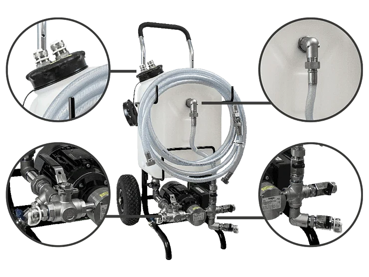 Mit einer maximalen Förderleistung von 60 l/min und einem Behältervolumen von 55 l eignet sich das Model 60/55 für den Einsatz in größeren Kreisläufen und zum Spülen von großen Warmwasserspeichern und Wärmetauschern.