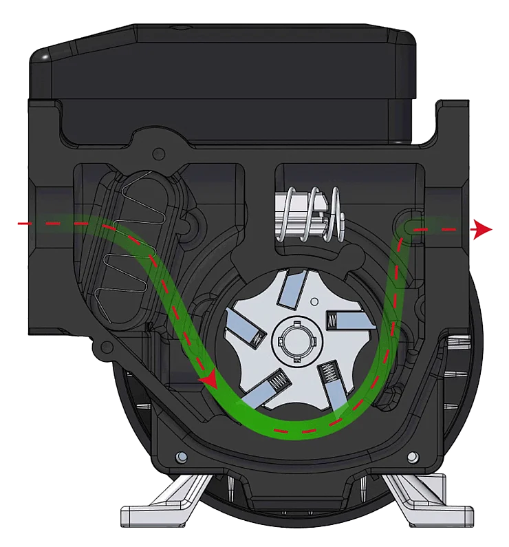 Die Flügelzellenpumpen von ZUWA verfügen über ein exzentrisch konstruiertes Gehäuse. Mit Hilfe von Lamellen (Schieber und Federn) entstehen dabei abgeschlossene Kammern, die sich beim Drehen des Motors vergrößern und verkleinern. Beim Vergrößern der Kammern saugen sie das saubere Fördermedium an, beim Verkleinern wird dieses über die Druckseite wieder ausgestoßen.