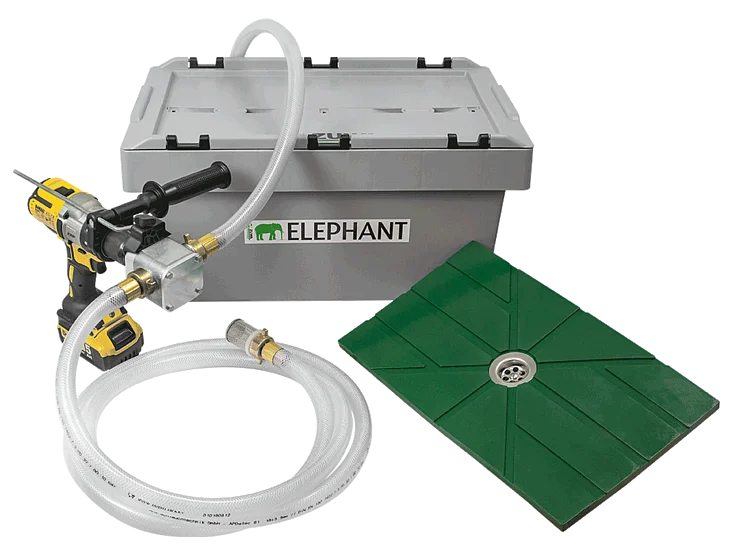 Das mobile Absaugset ist preisgünstig, schnell aufgebaut und mit einer Bohrmaschine oder einem Akkubohrer sofort einsatzbereit. In schwer zugänglichen Räumen ohne Netzanschluss können Sie mit dem ELEPHANT schnell reagieren.